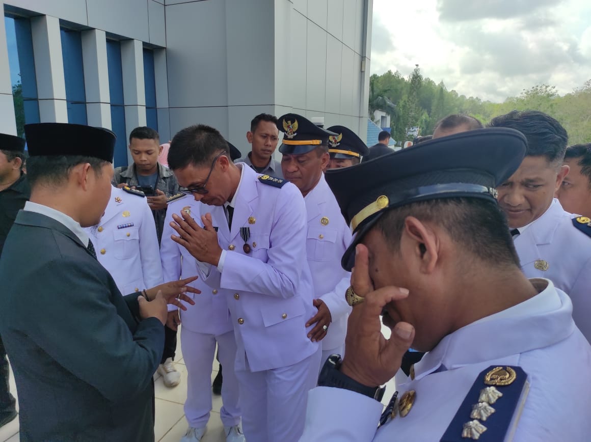 Asmawa Tosepu selaku Pj Wali Kota Kendari yang lama berpamitan dengan Camat dan Lurah usai diganti. Foto: Ismail, KN