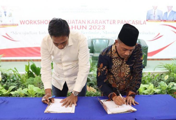 Kakanwil Kemenag Sultra, Muhammad Saleh bersama Kepala Dikbud Sultra, Yusmin melakukan penandatanganan MoU. Foto : Ist.