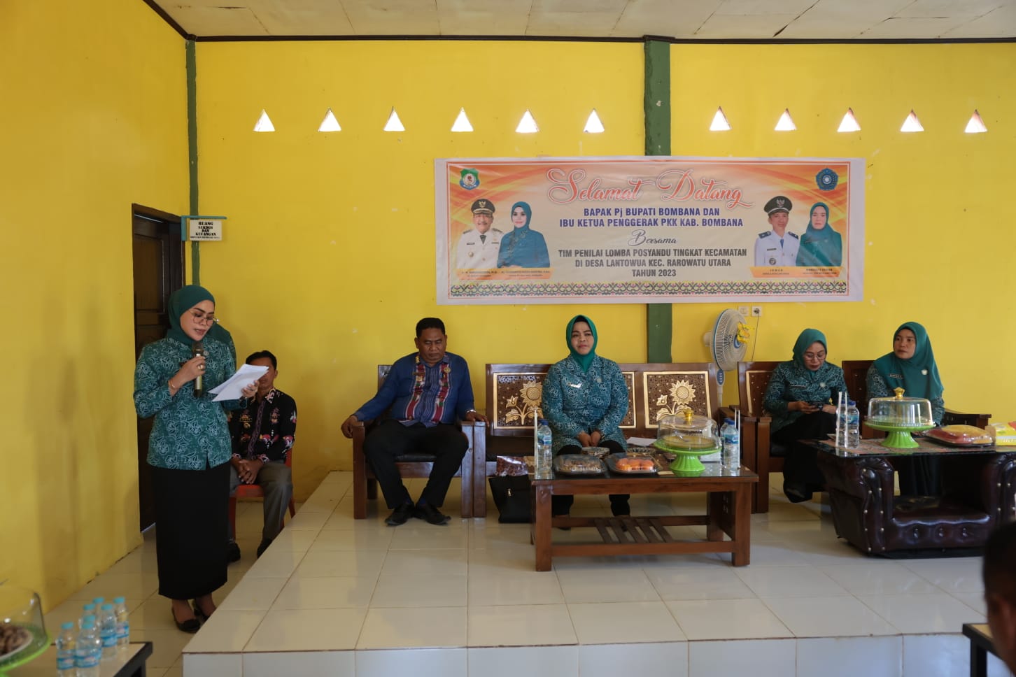 Pj Ketua TP-PKK Kabupaten Bombana Fatmawati Kasim Marewa Burhanuddin saat membawakan sambutan saat penilaian Lomba posyandu. Foto : Kominfo Kabupaten Bombana.