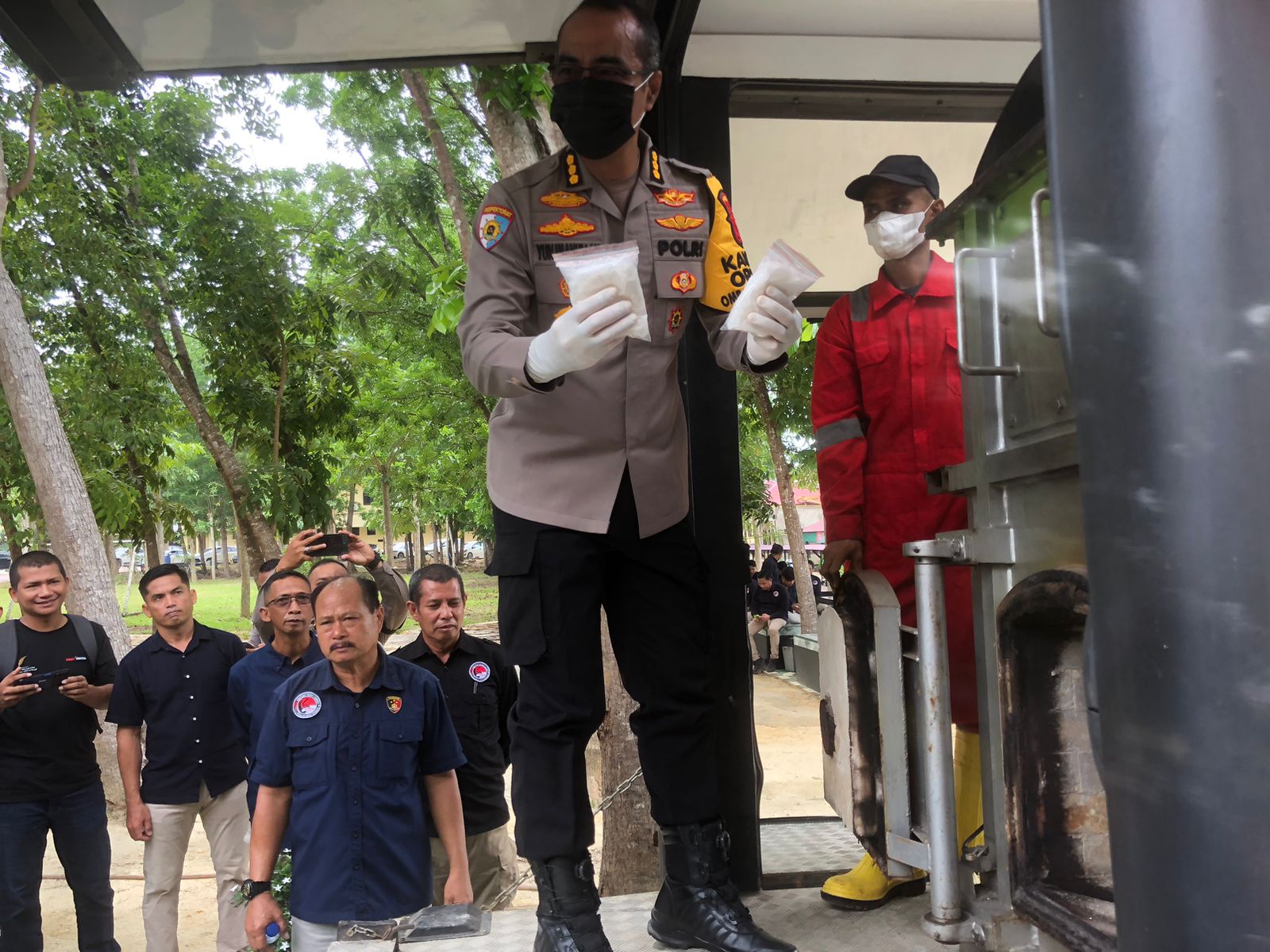 Pihak kepolisian saat akan memasukkan barang bukti ke dalam mobil incinerator untuk dimusnahkan. Foto: Ismail, KN