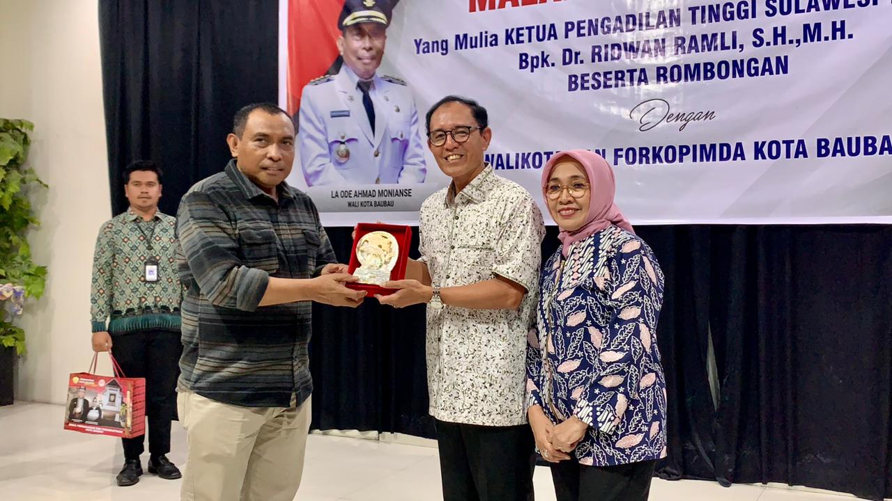 Walikota Baubau La Ode Ahmad Monianse memberikan Hadiah Kepada Ketua Pengadilan Tinggi Sulawesi Tenggara Dr Ridwan Ramli, S.H.,M.H Foto : Beudin, Keratonnews.com