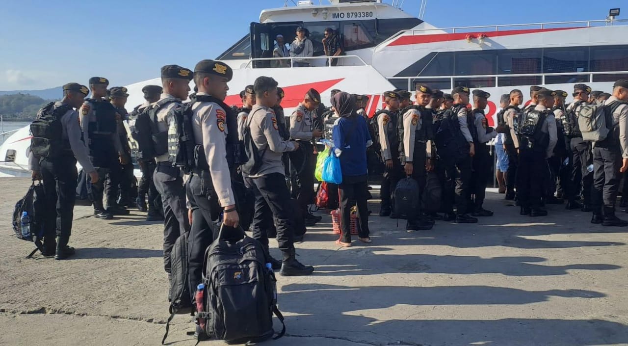 Ratusan personel gabungan Polda Sultra saat akan bertolak dari Kendari ke Baubau untuk melakukan pengamanan di debat Pilgub 2024. Foto: Humas Polda Sultra