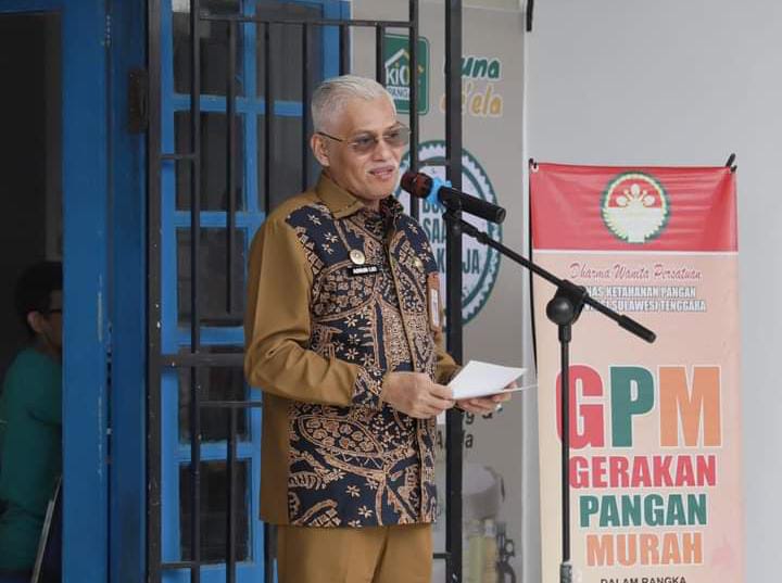 Sekda Sultra, Asrun Lio saat menghadiri Gerakan Pangan Murah Disketapang Sultra. Foto : Diskominfo Sultra.